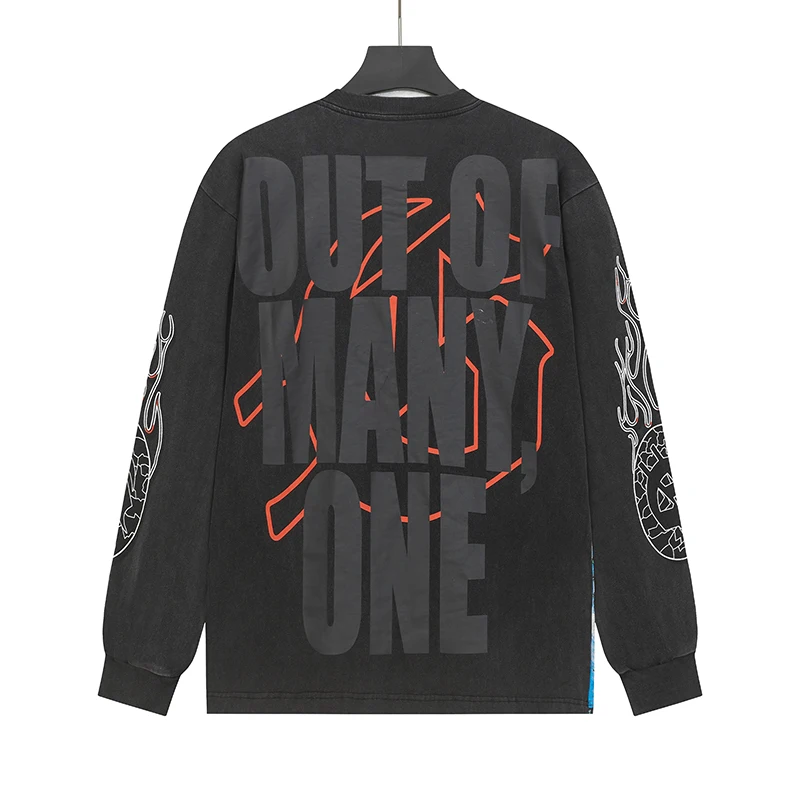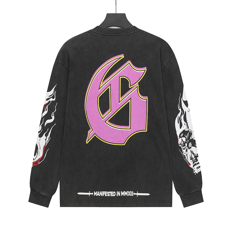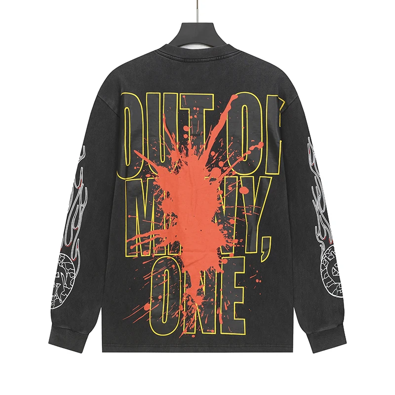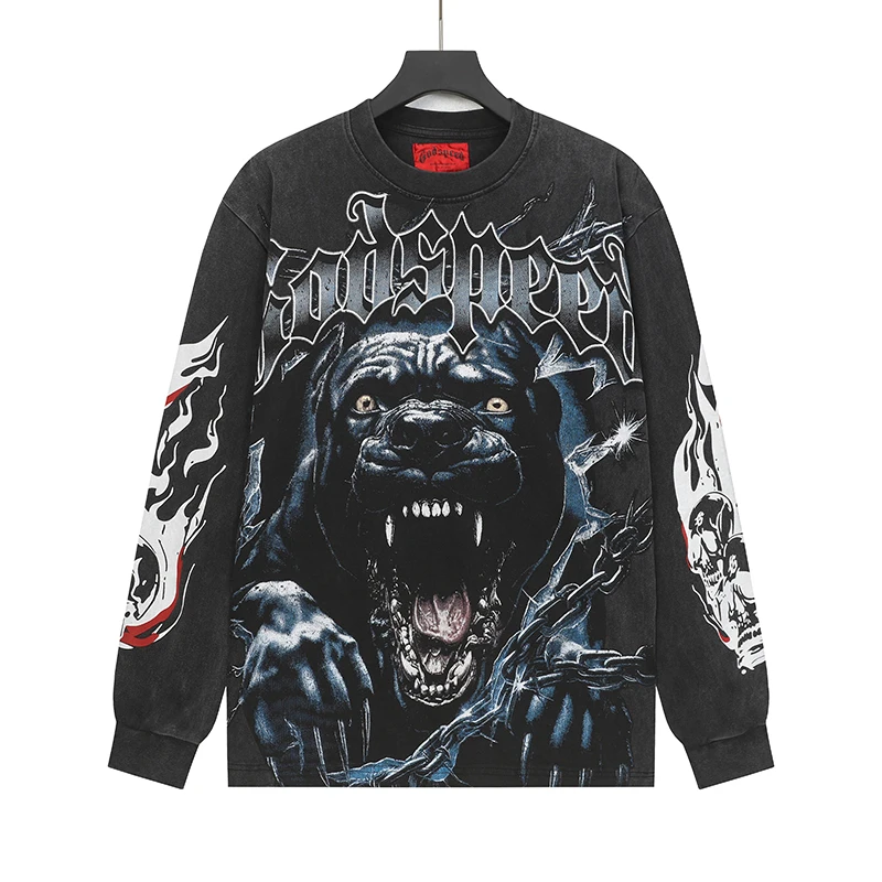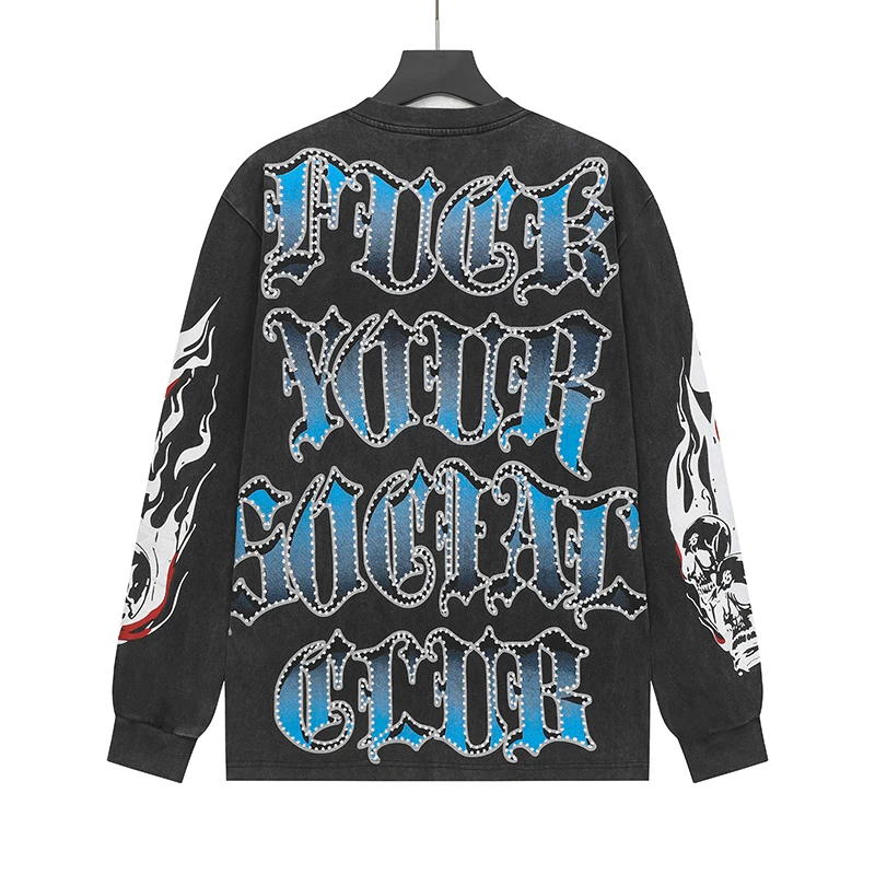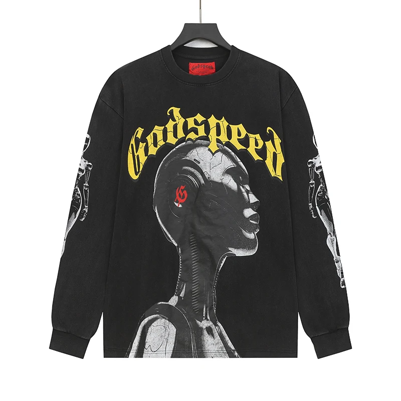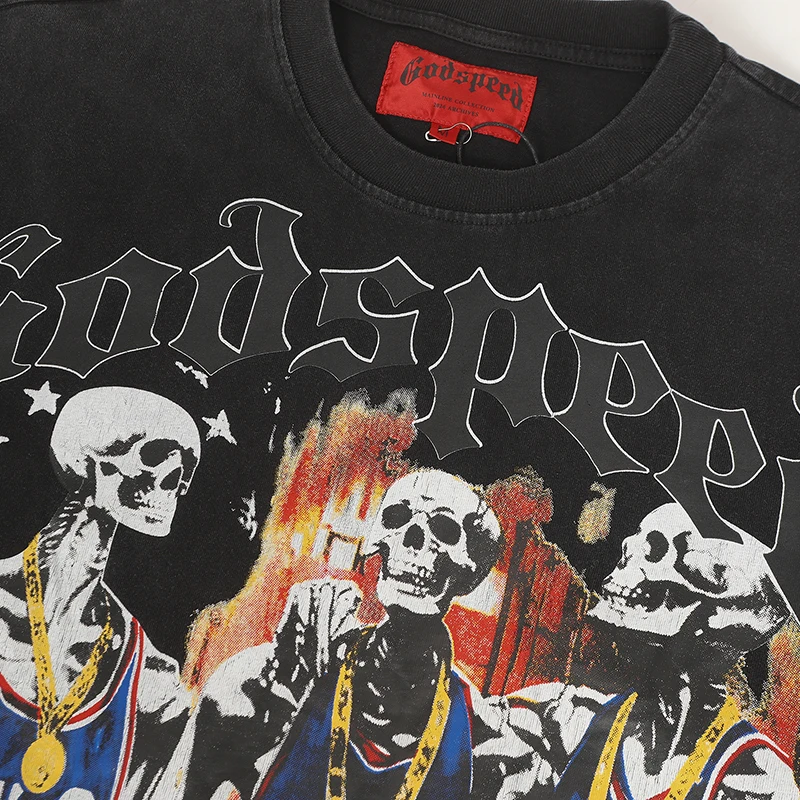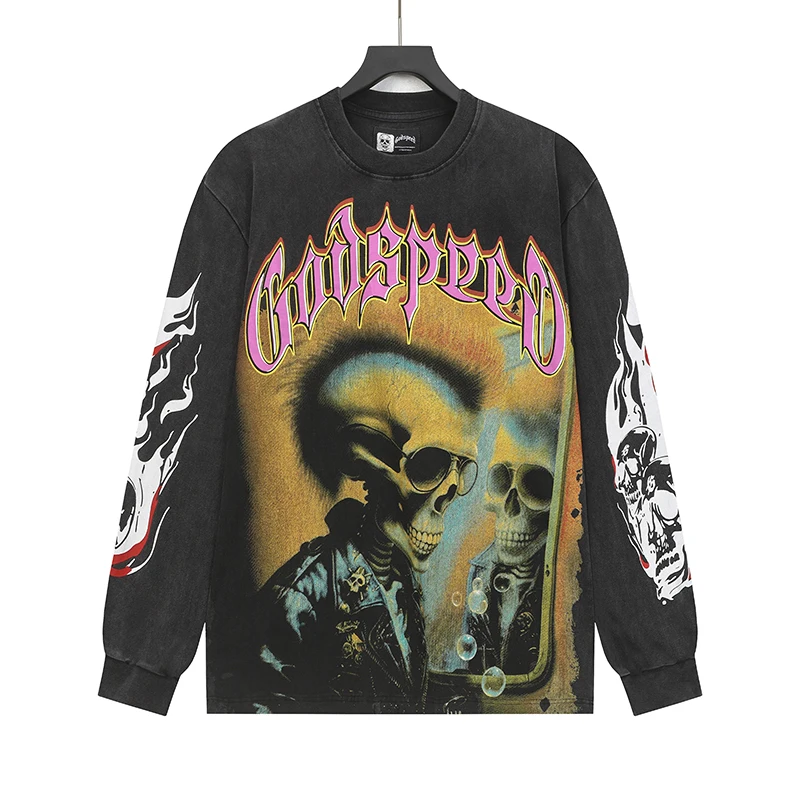 American Streetwear Godspeed Long Sleeve Graffiti Skeleton Print Casual Trend Washed 100% Cotton Round Neck T-Shirt