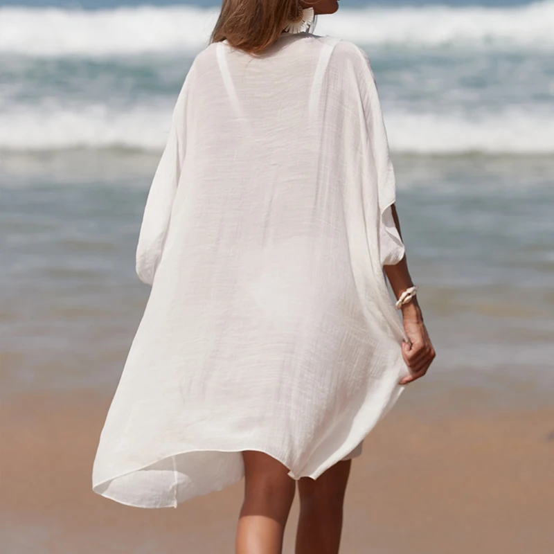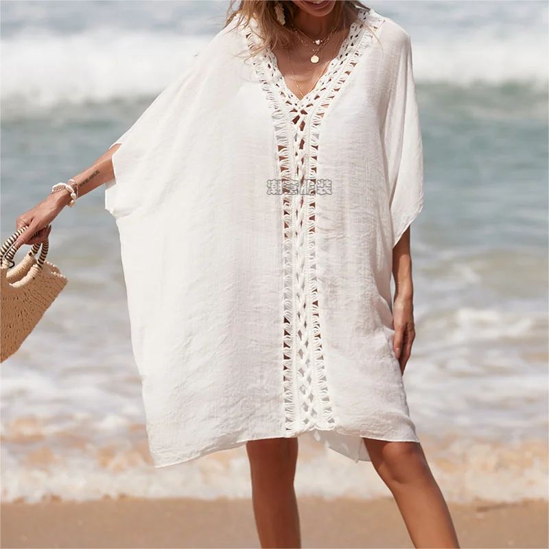 Beach Cover Up for Woman Tunic Bikini Dress Solid Color Crochet Cutout Loose Sun Protection Swimsuit Robe Bathing Suit Sundress