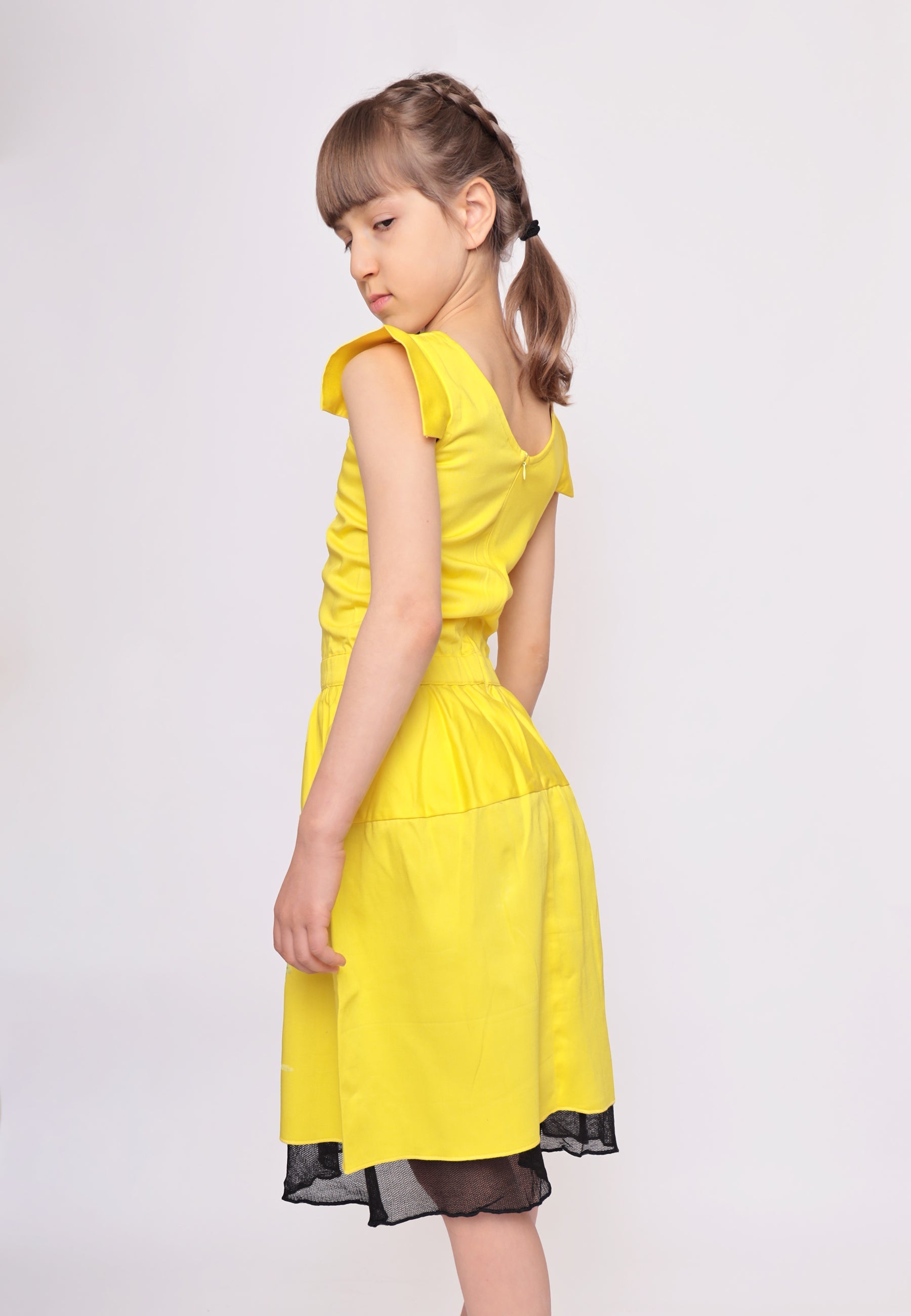 The Canopy Sundress in shiny mercerized yellow cotton. V-neck front and back, cap sleeves, and elastic waist. Zipper in the back. Full pleated skirt features hand embroidered pixel treehouse print. Peek-a-boo black mesh lining. This girl dress is perfect for summer picnicking.