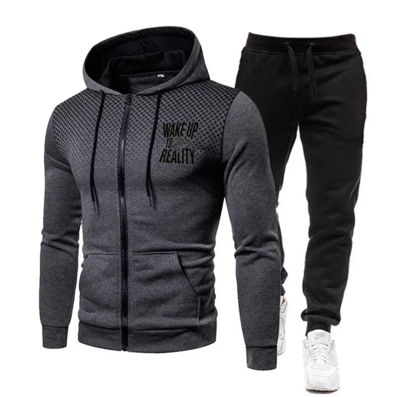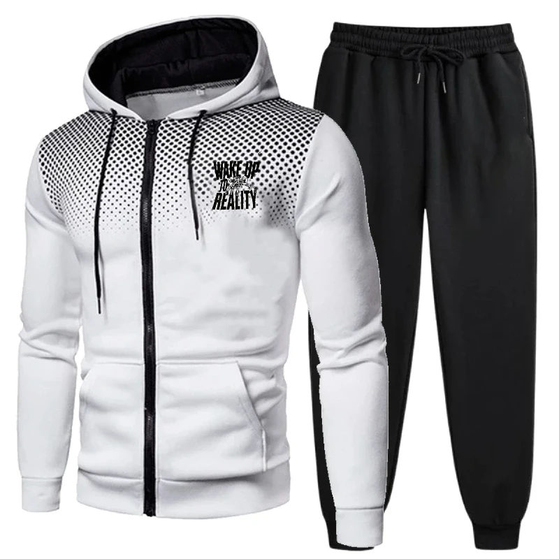 Men's Jacket Set Black Red Gradient Printed Wake Up Reality Text Hoodie Zipper Sweatshirt for Casual Outdoor Sport Wear