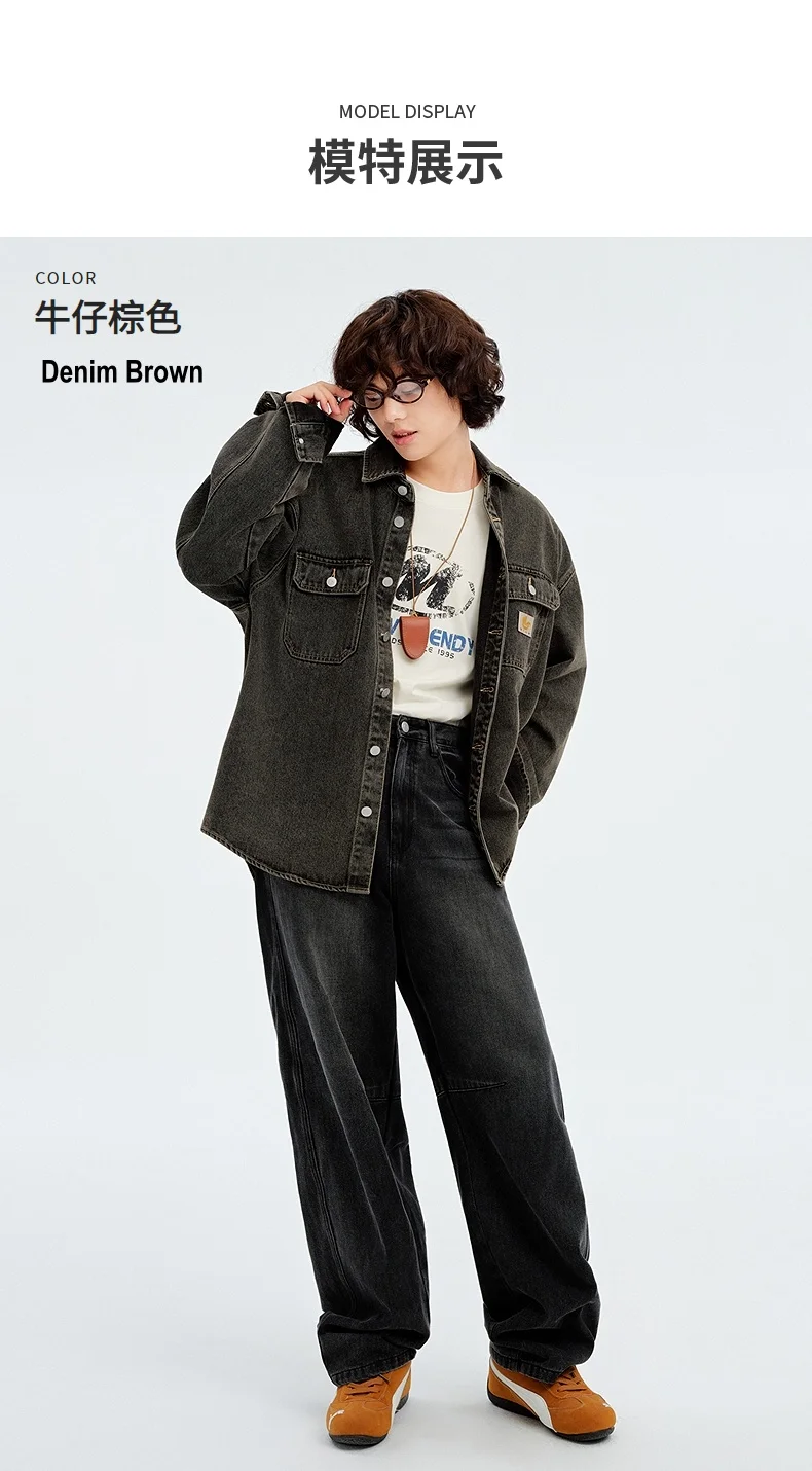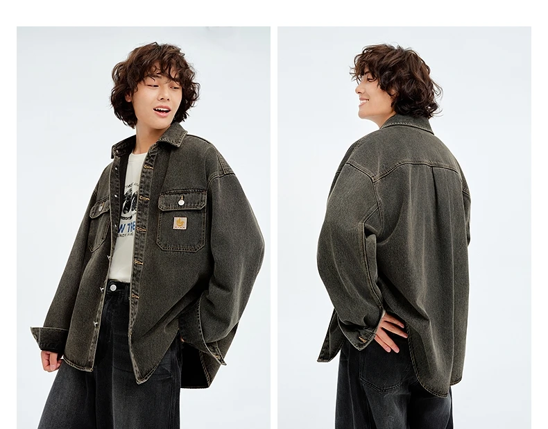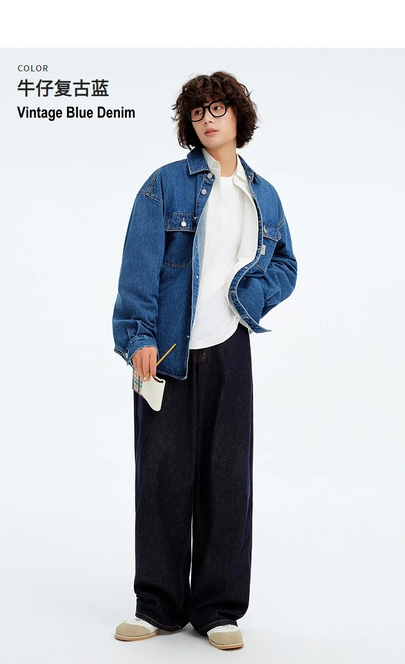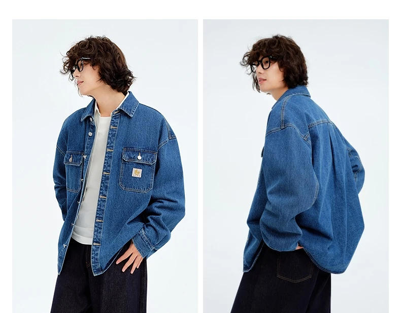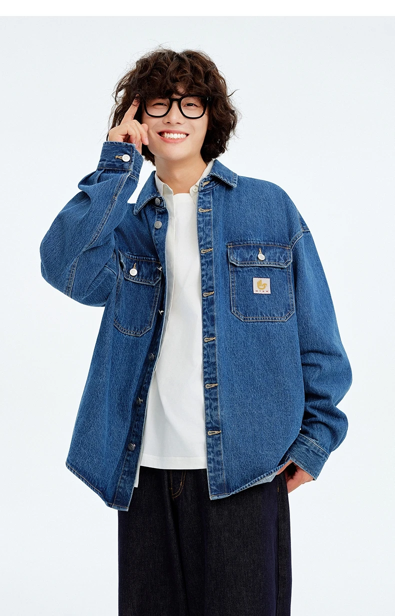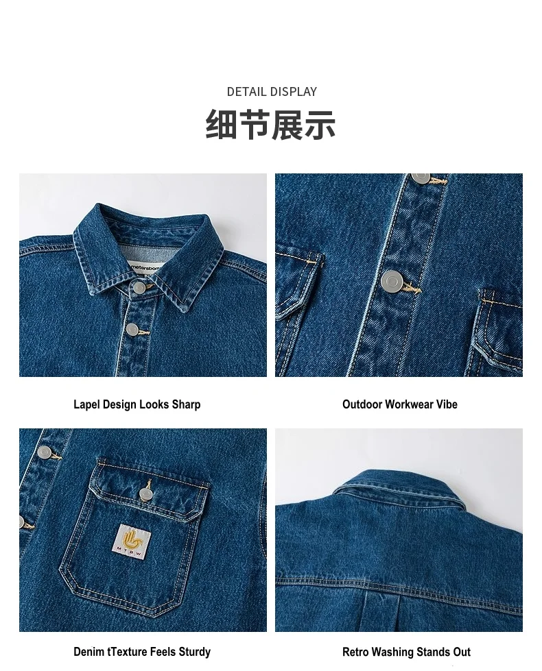 Metersbonwe Men's Vintage Distressed Utility Denim Shirt Jacket Classic Flap Pockets Oversized Fit Outerwear Casual Street Style