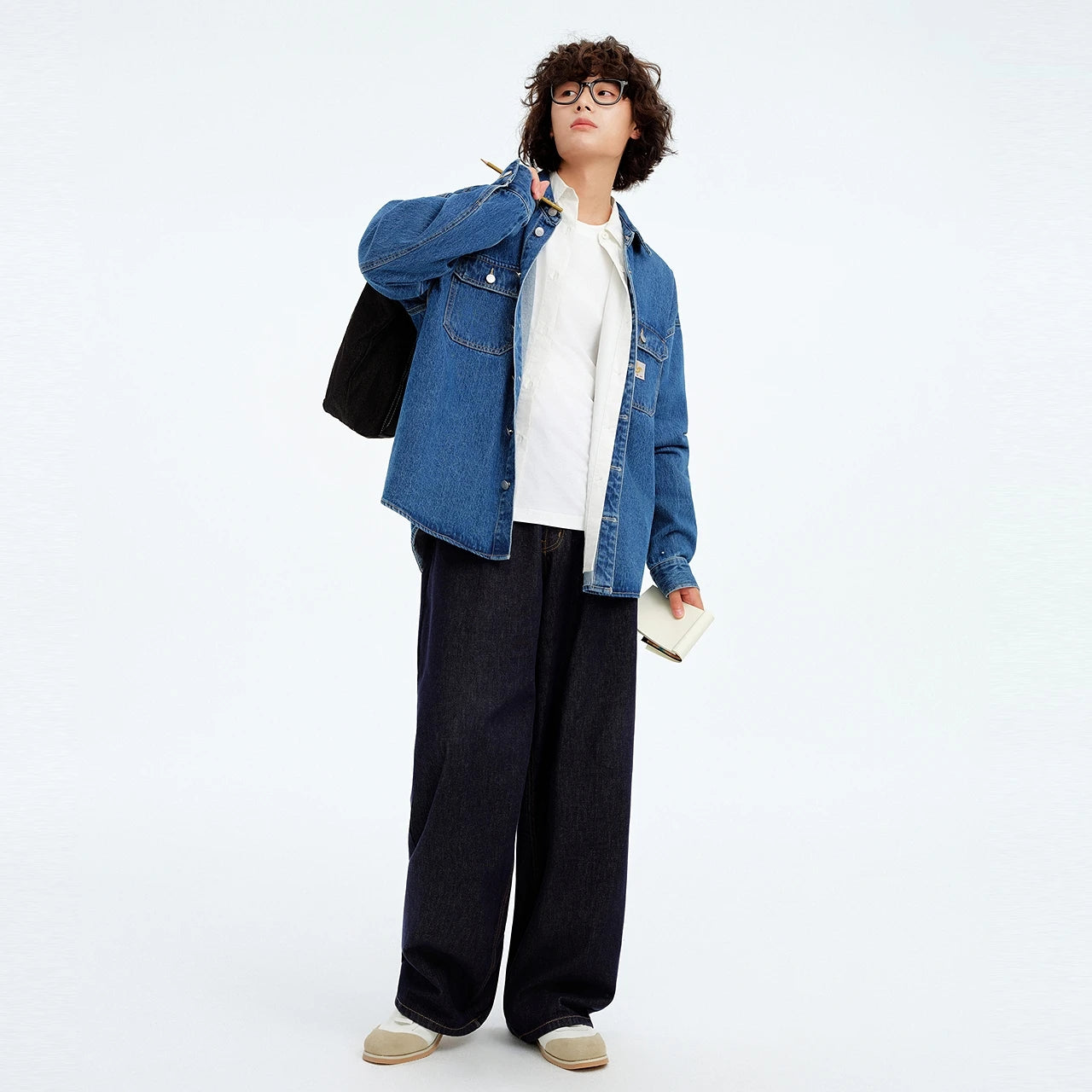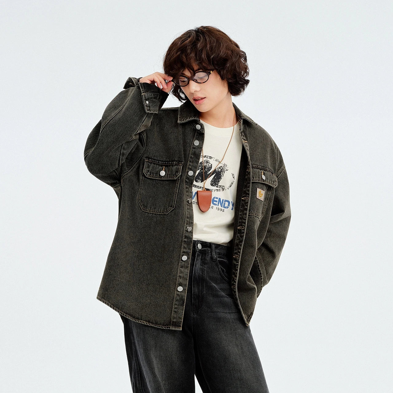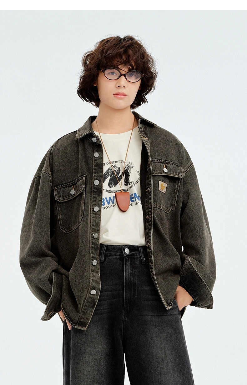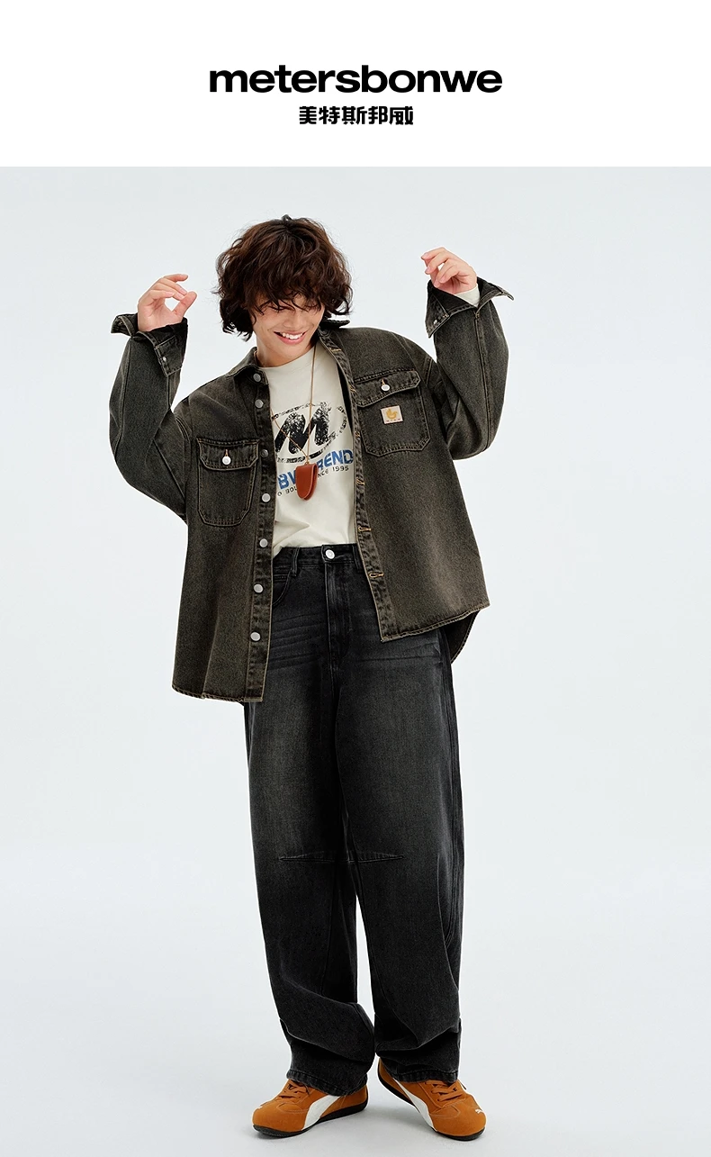 Metersbonwe Men's Vintage Distressed Utility Denim Shirt Jacket Classic Flap Pockets Oversized Fit Outerwear Casual Street Style