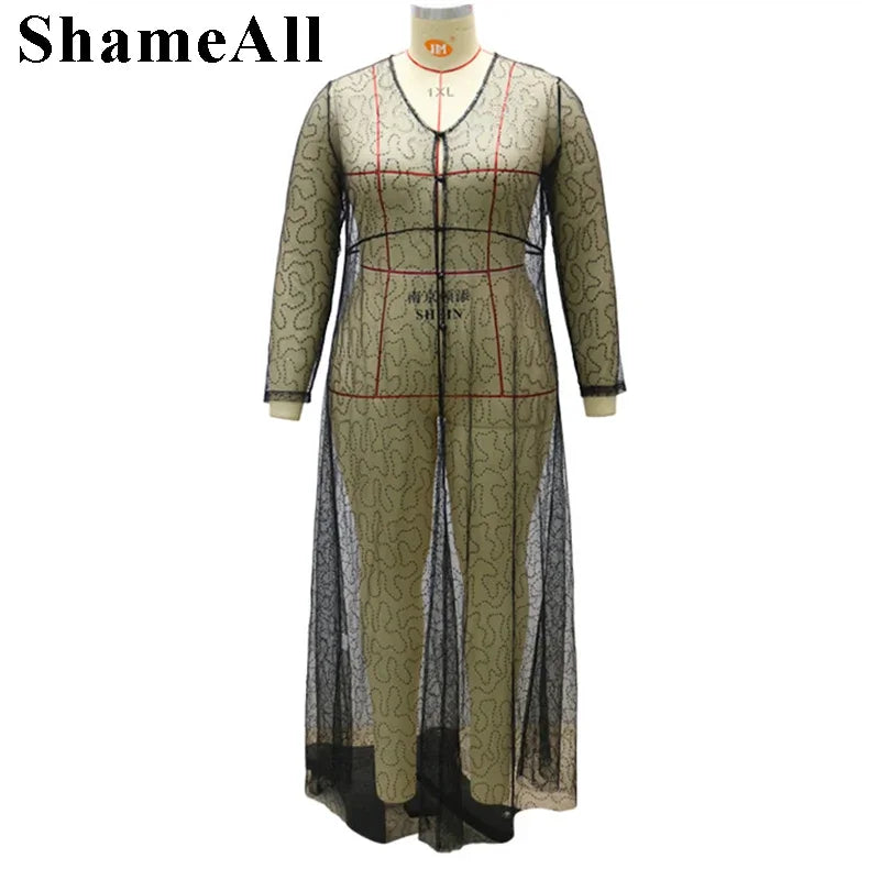 Plus Size Sequined Long Maxi Dres 4XL Summer See Through Red Sexy V Neck Transparent Floor Length Dress Club Party Robe Vestidos
