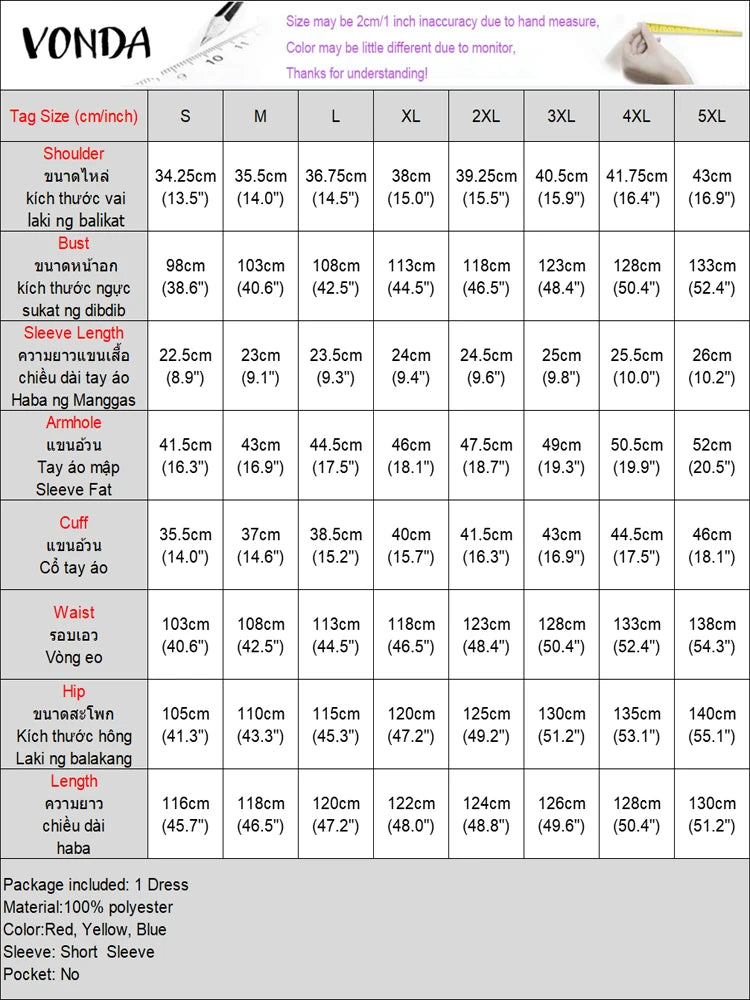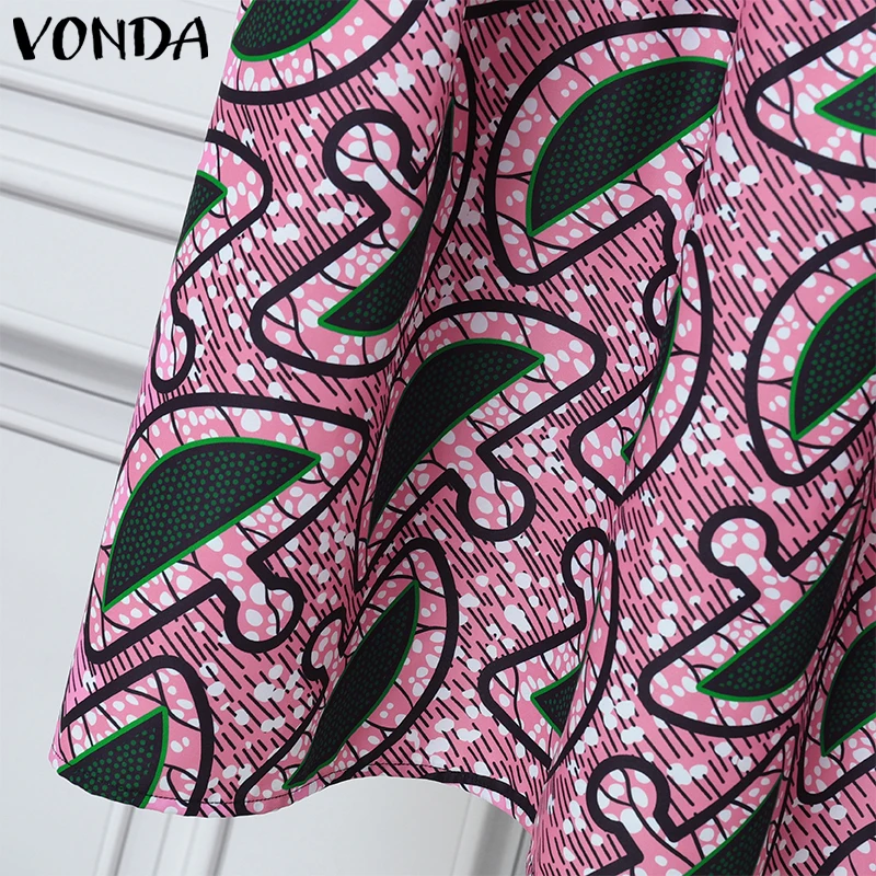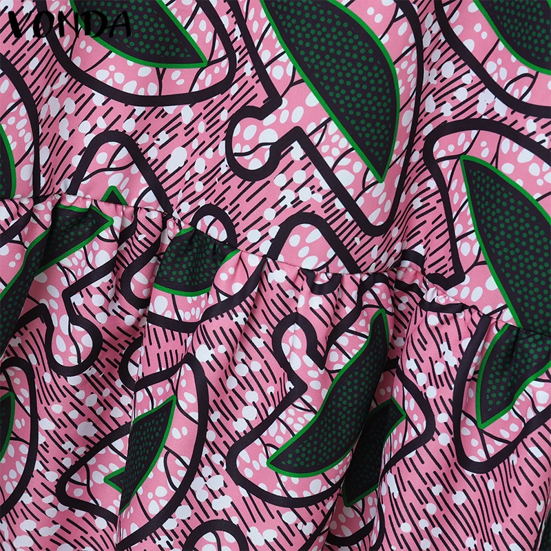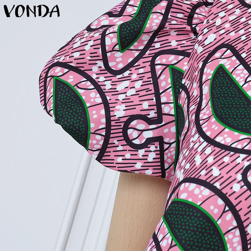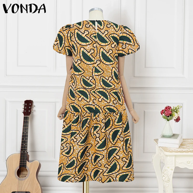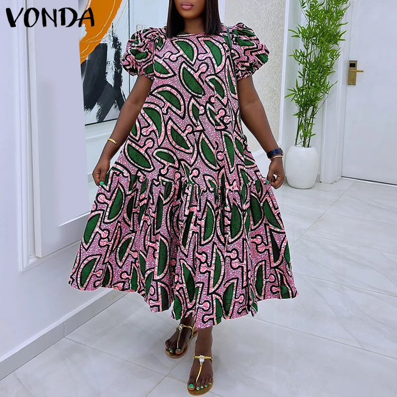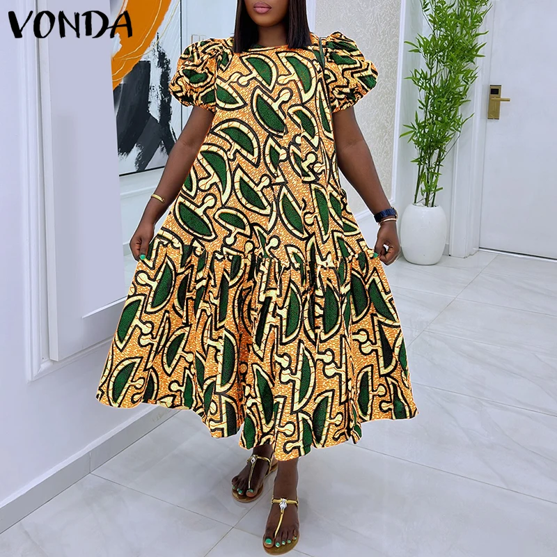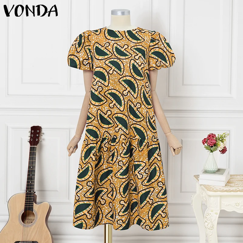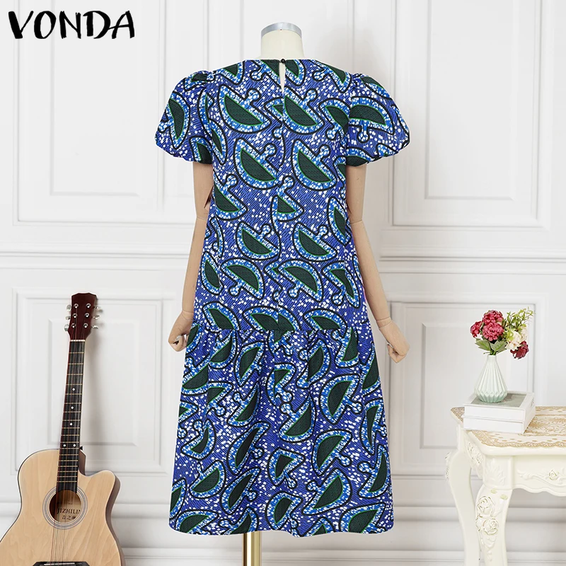 Plus Size Women Dress Vintage Print Sundress 2025 VONDA Puff Sleeve Casual Loose Vestidos Fashion Ruffled Midi Robe Femme