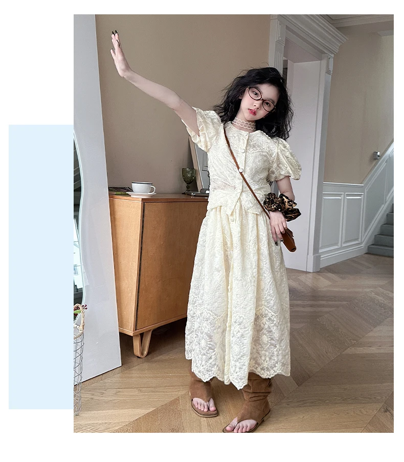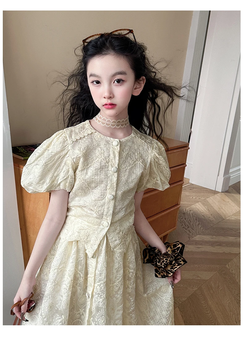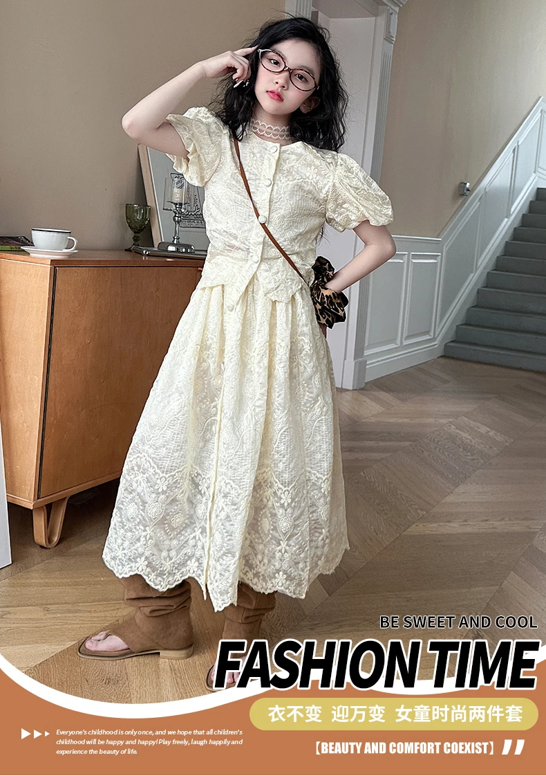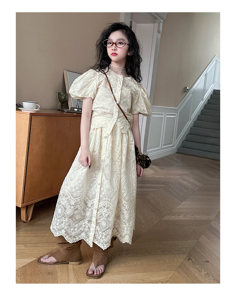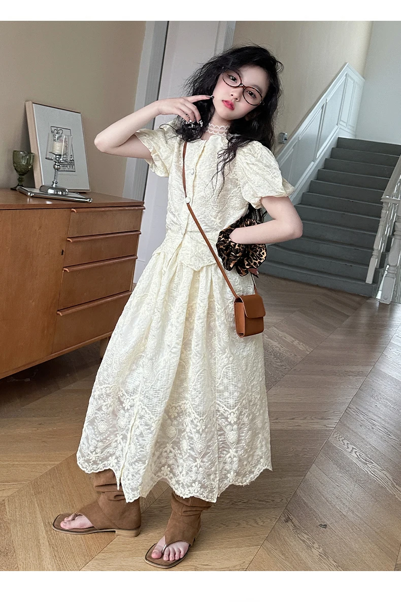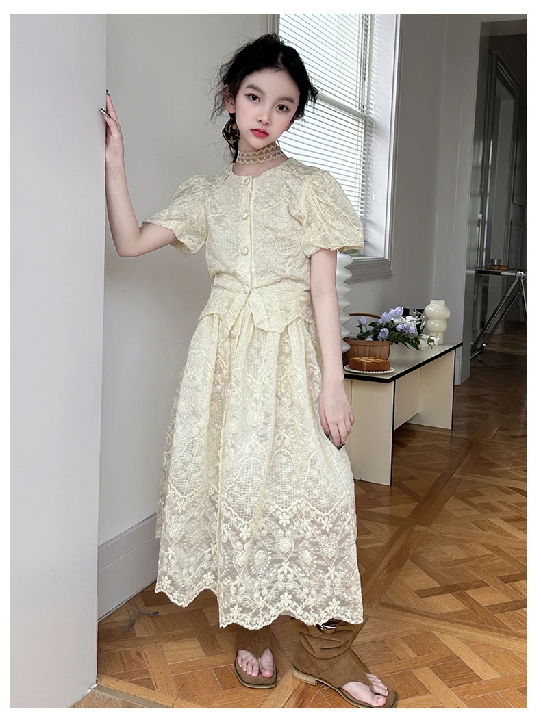 summer teen girl Embroidery dress set Bubble sleeve lace top+long skirt 2pcs junior kid suit child outfits vetement enfant fille