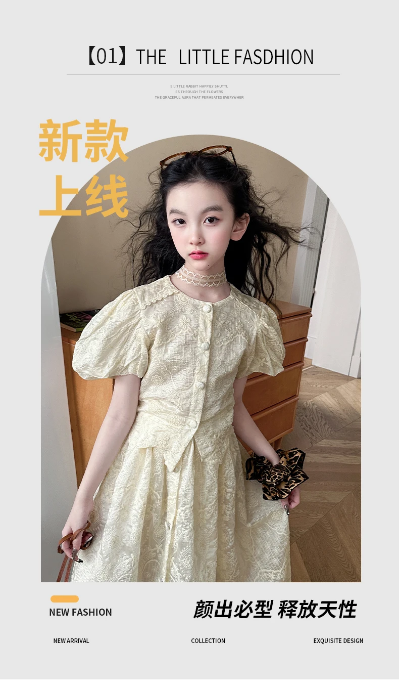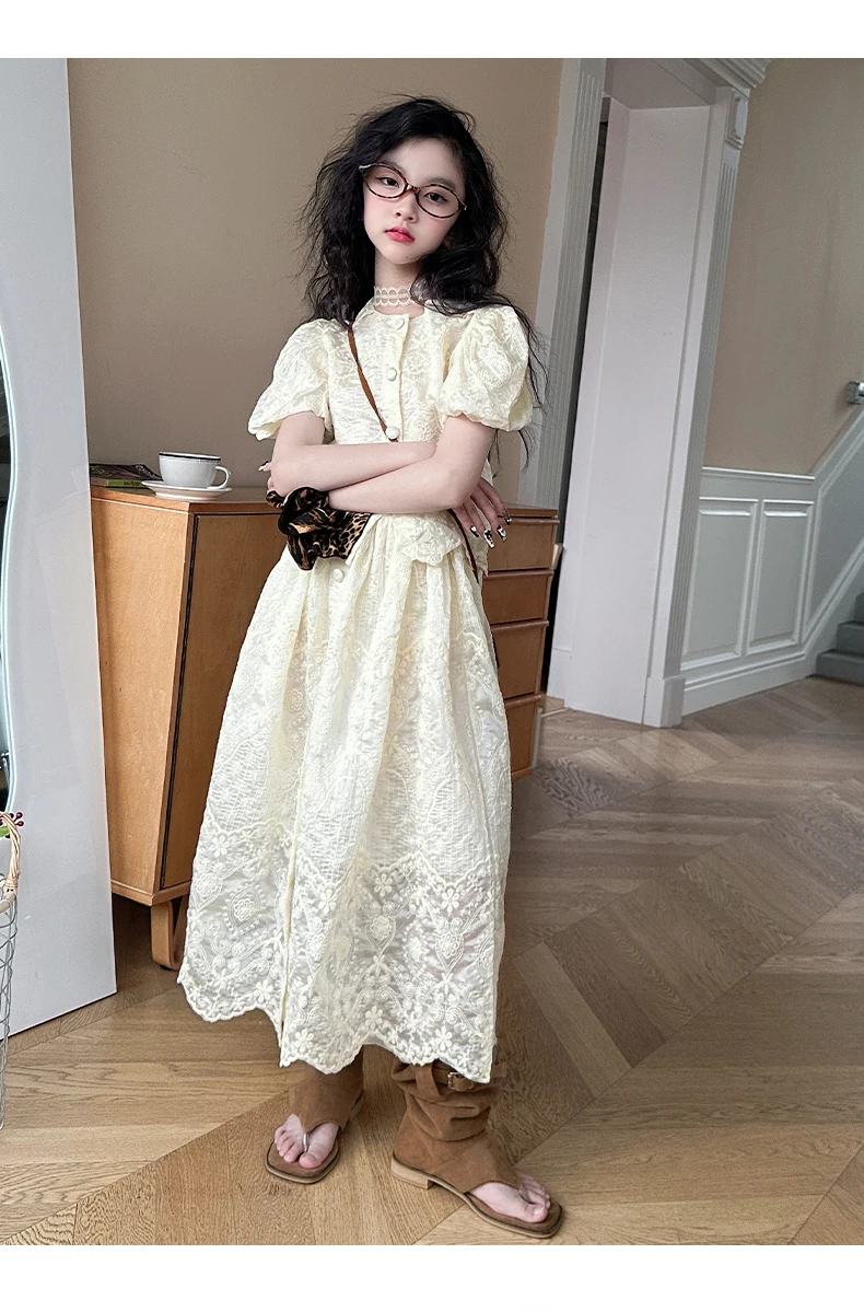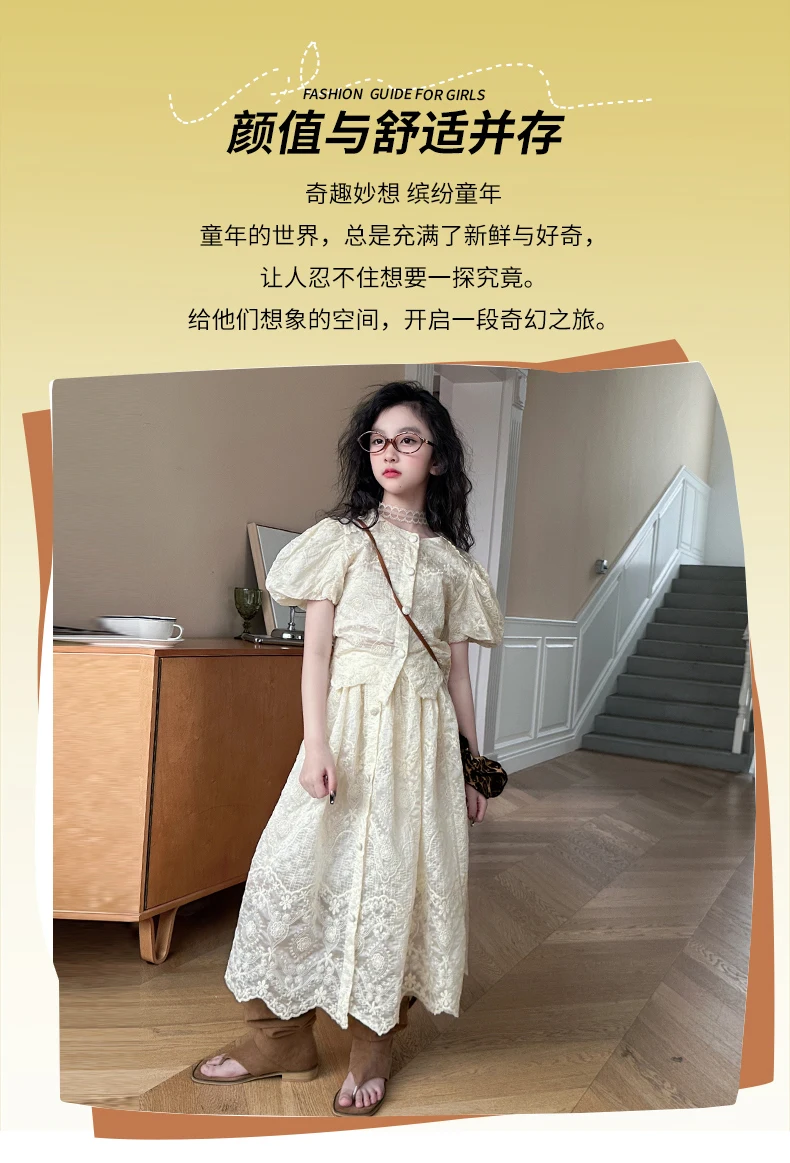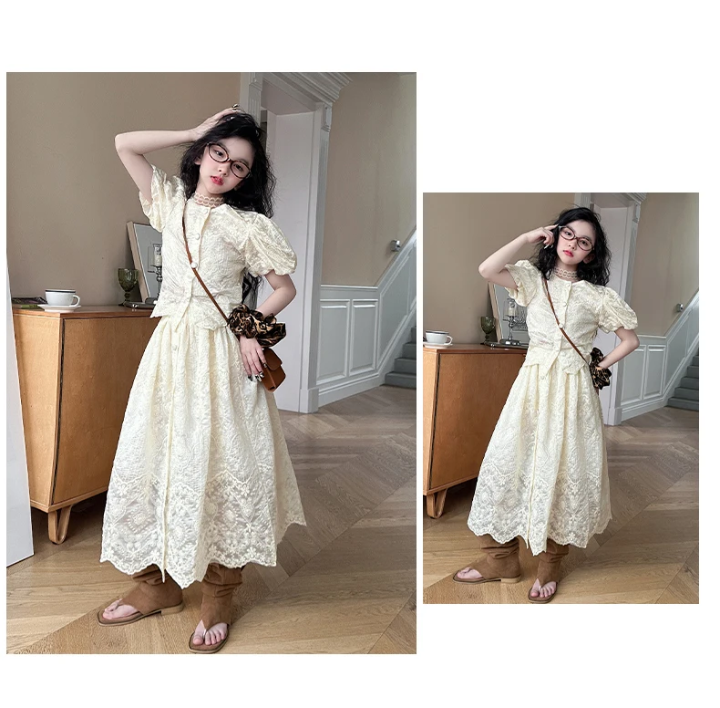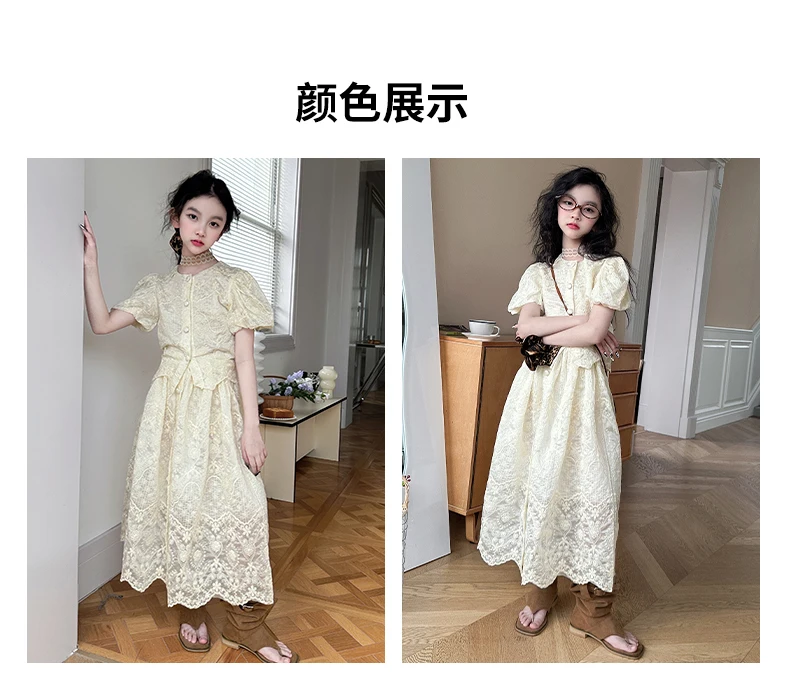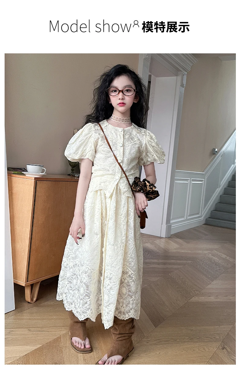 summer teen girl Embroidery dress set Bubble sleeve lace top+long skirt 2pcs junior kid suit child outfits vetement enfant fille