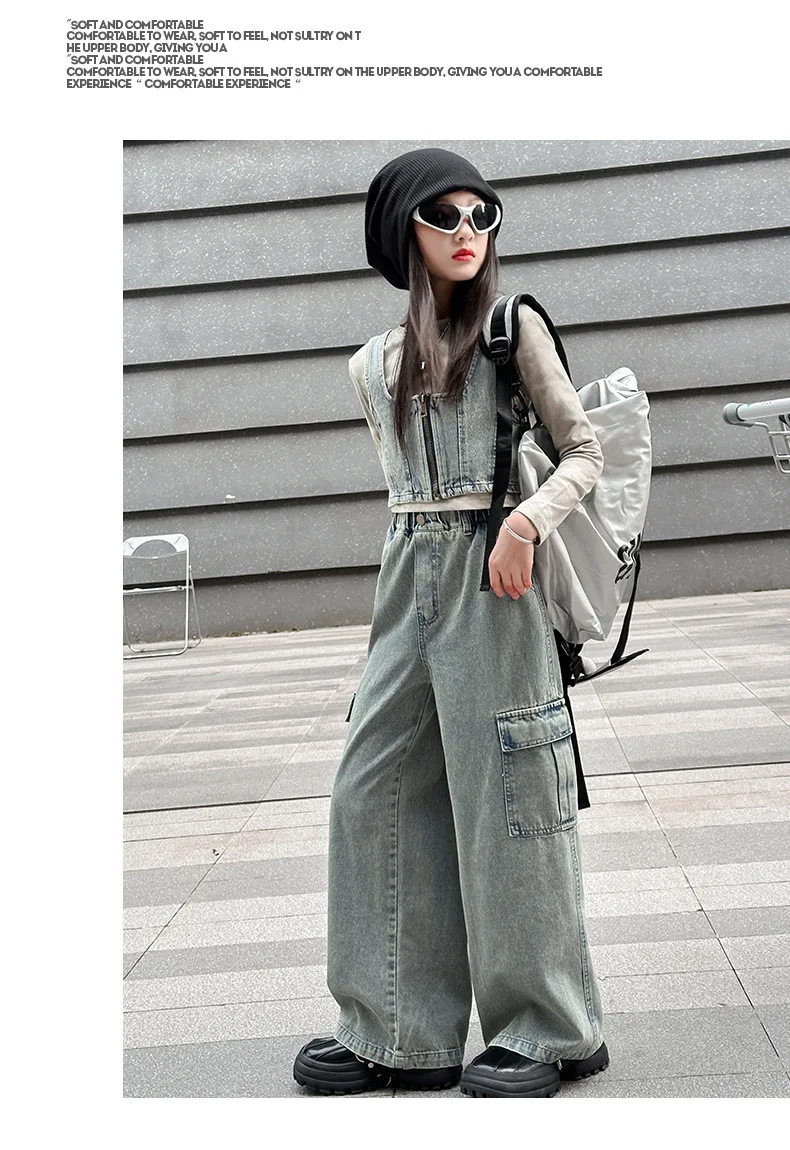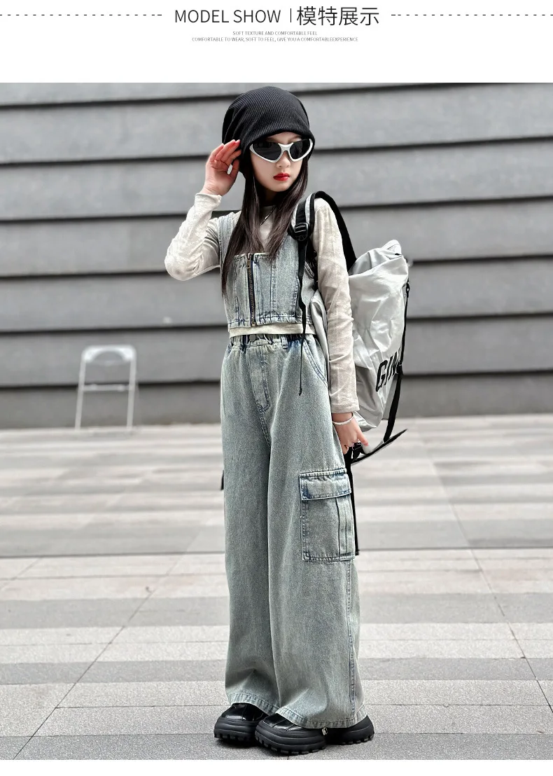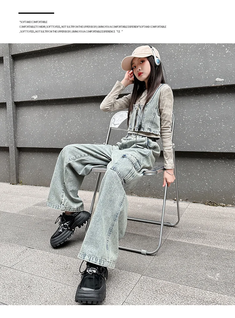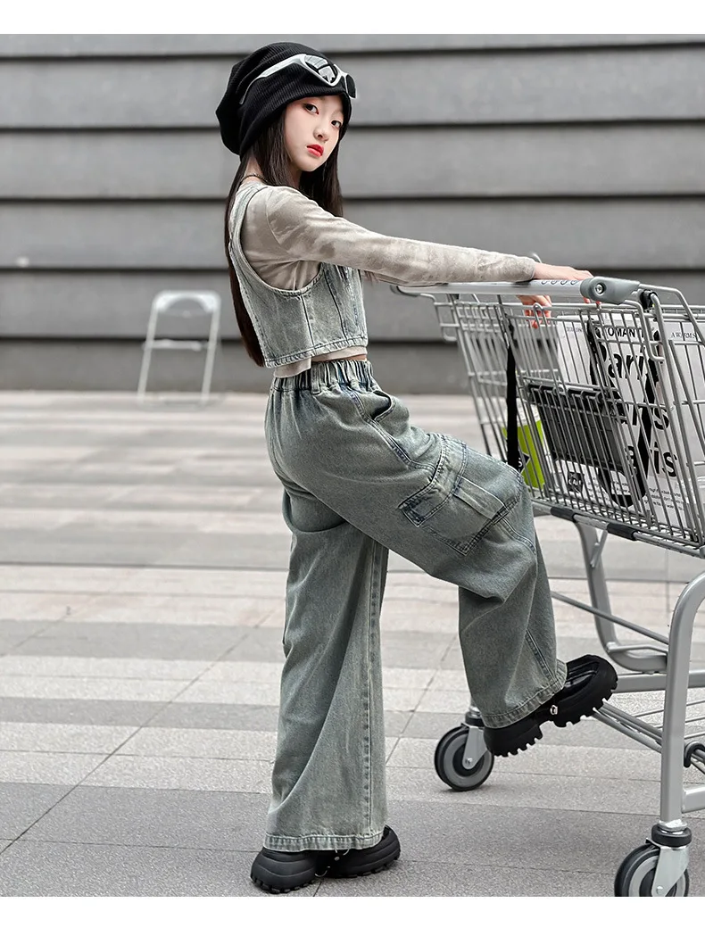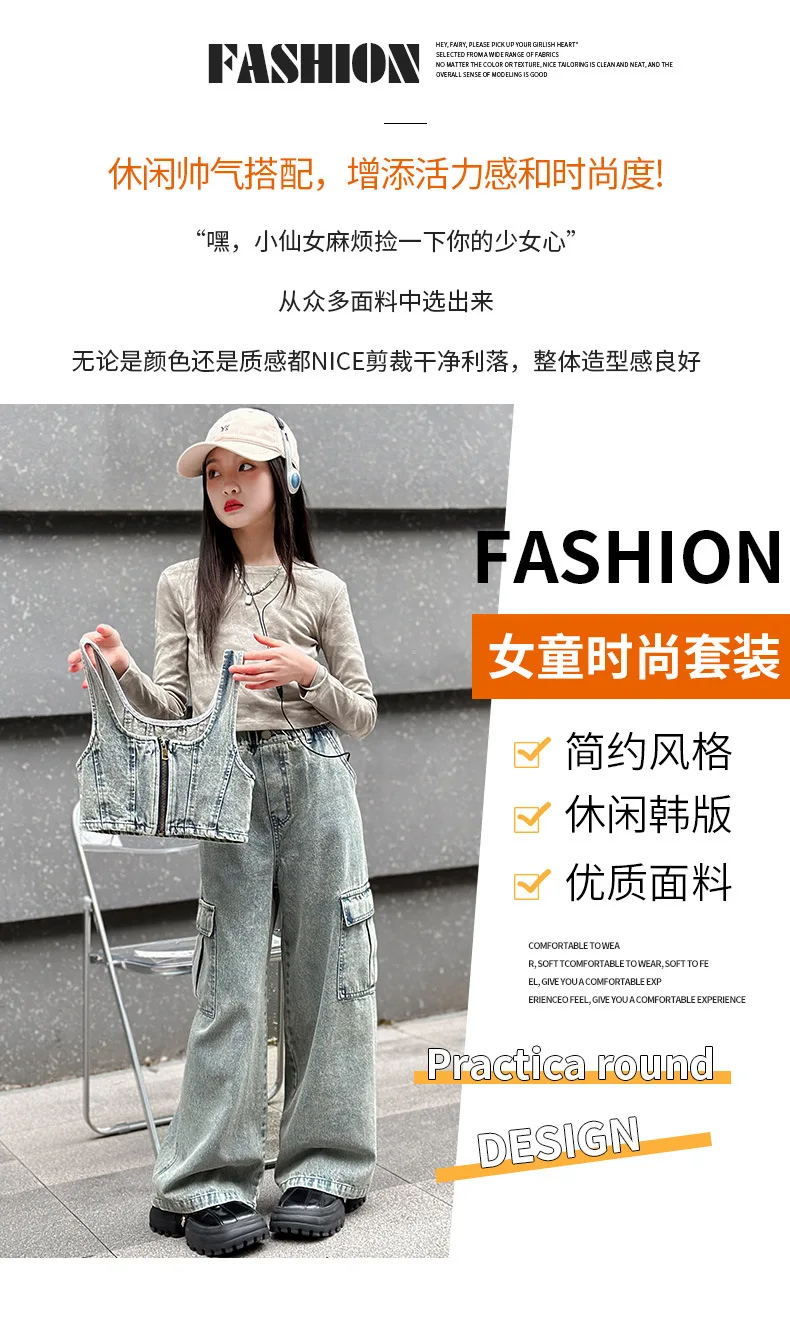 vetement enfant fille denim vest+top t shirt+cargo pants jeans three pcs kids girls clothes sets childer outfits clothing suit