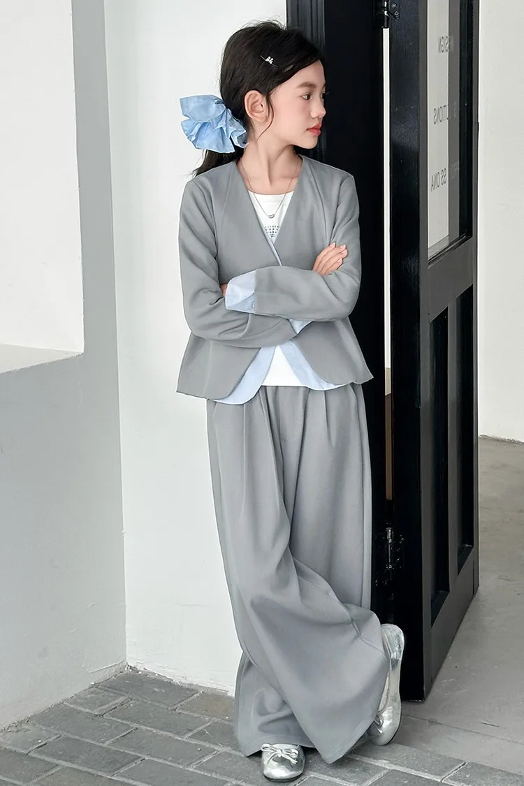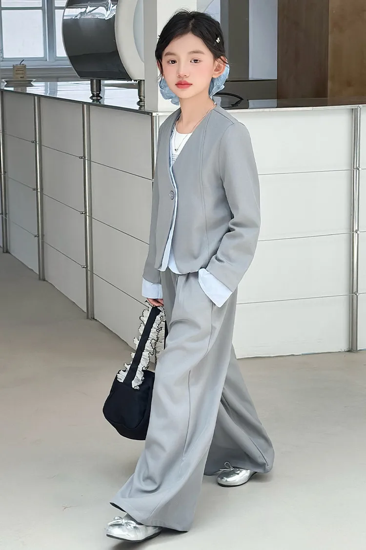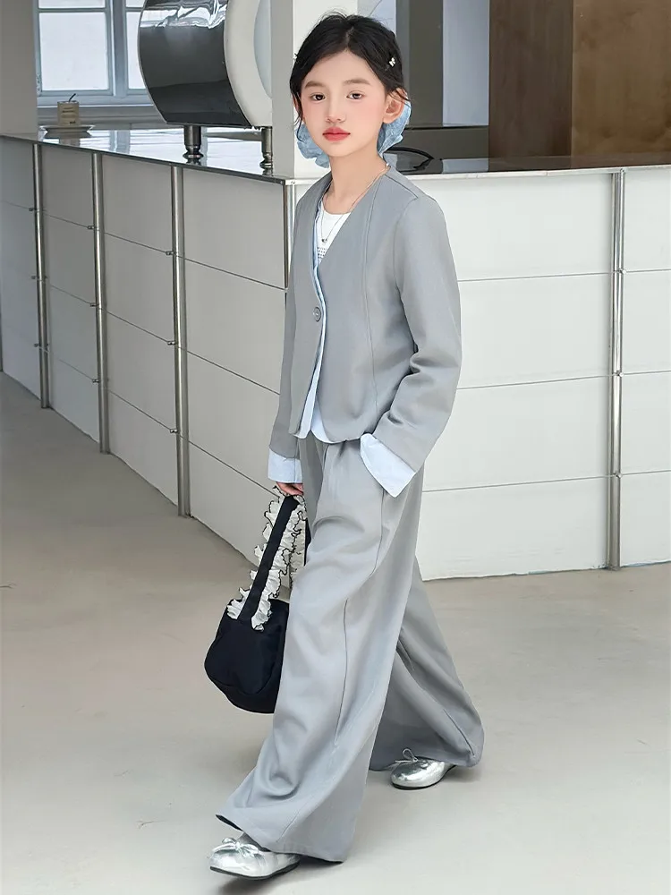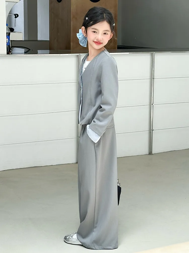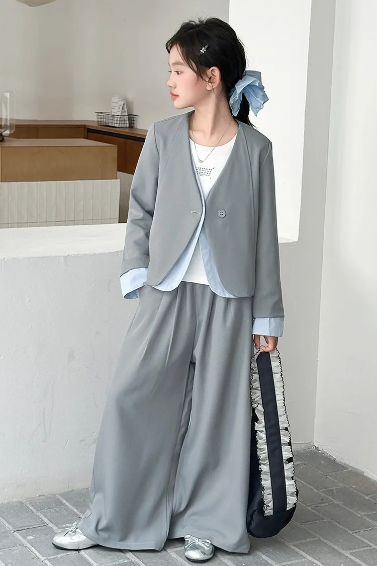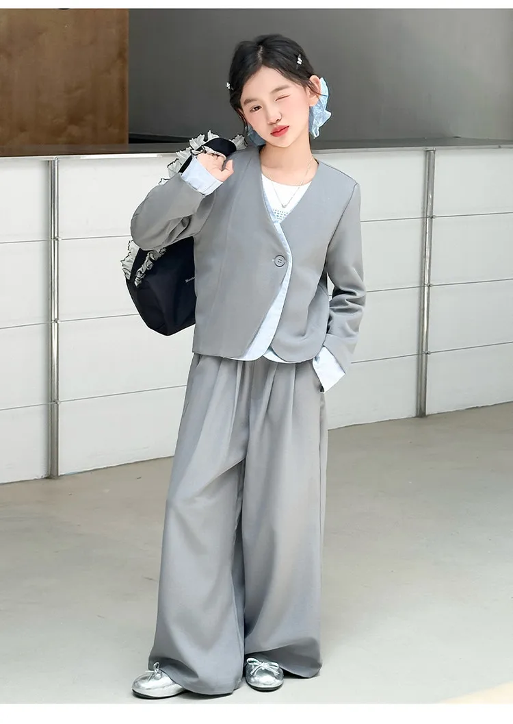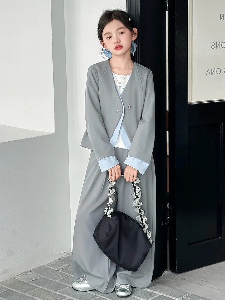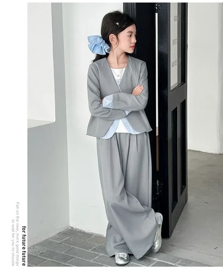 vetement enfant fille teen girls suit set Color blocked suit jacket+wide leg pants 2 junior kids gray clothes sets child outfits