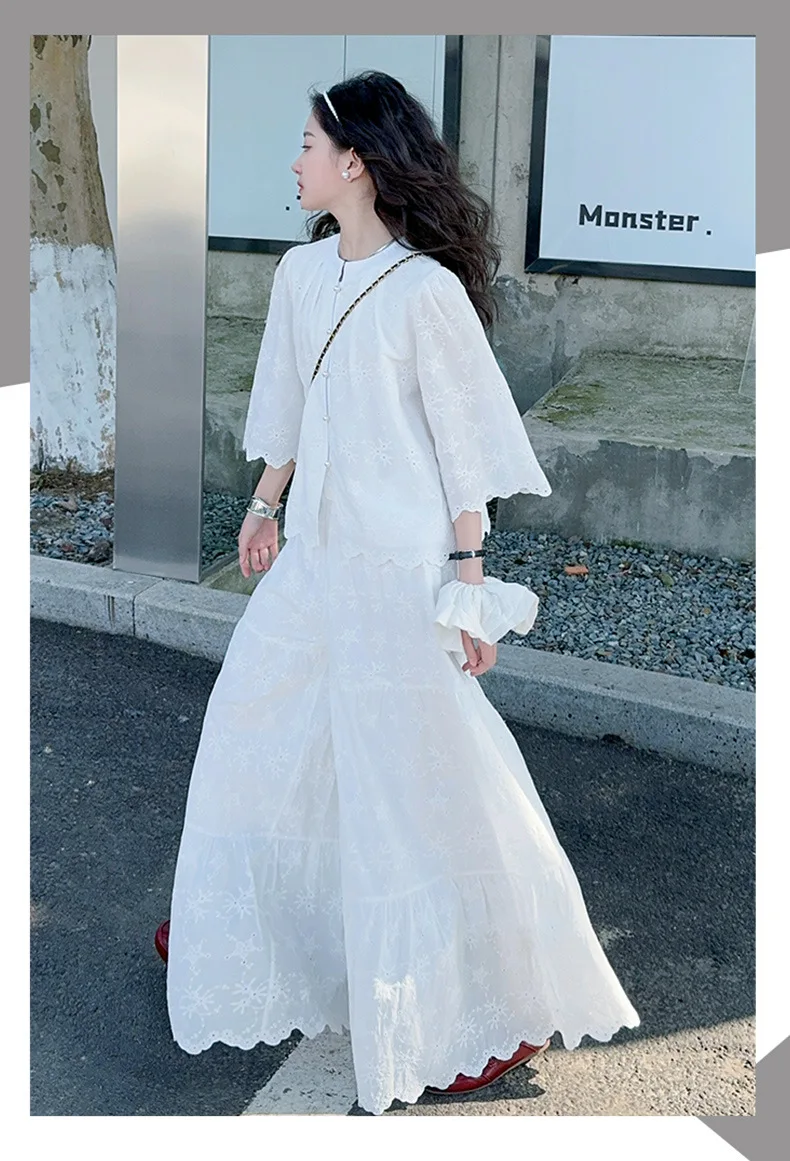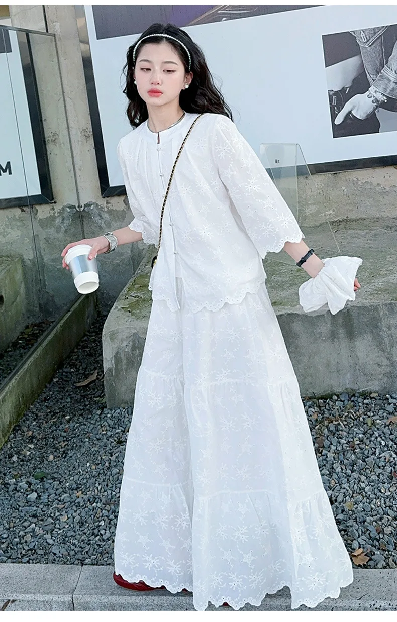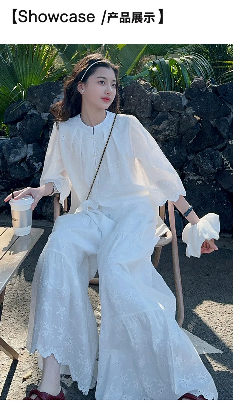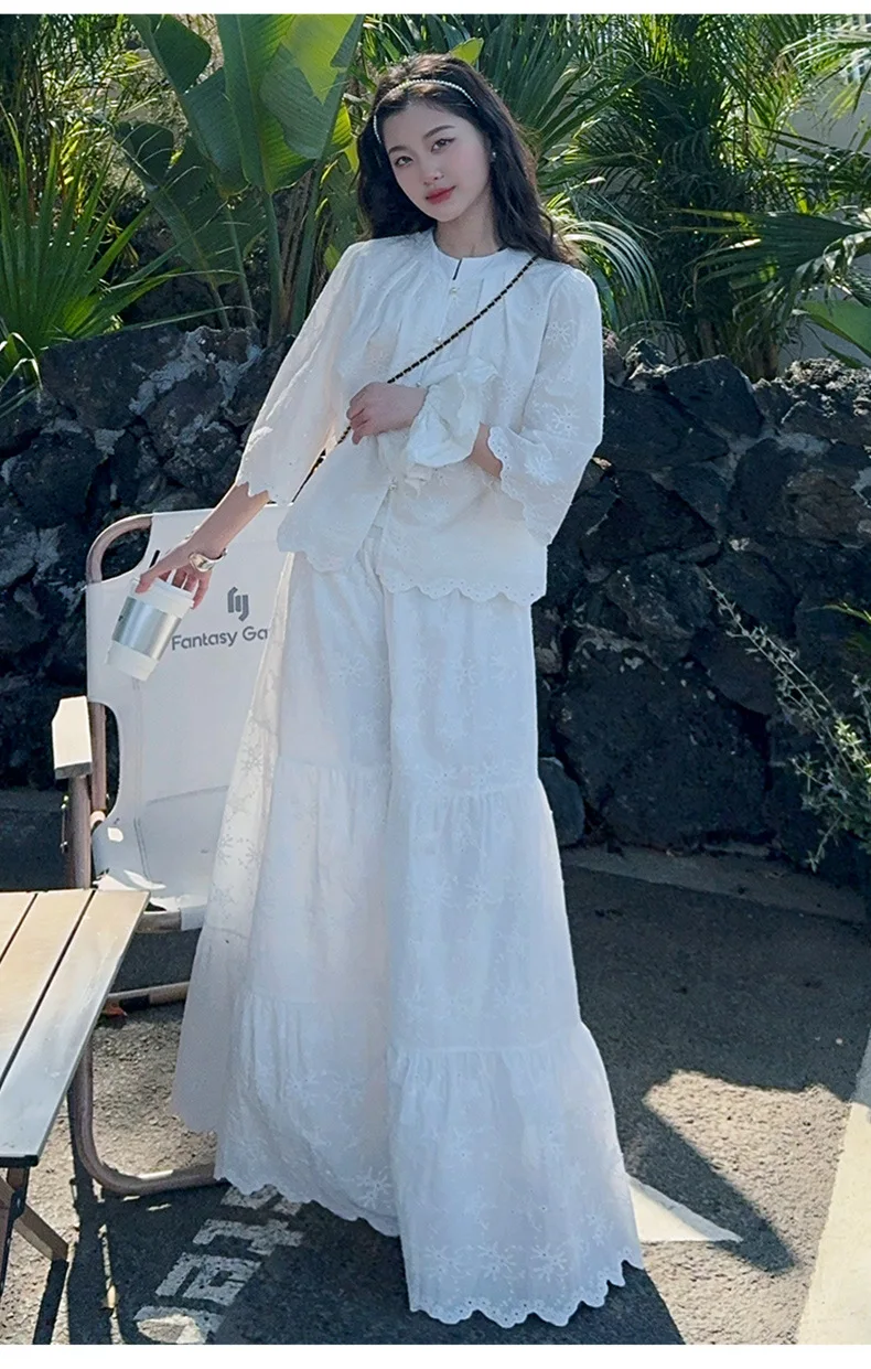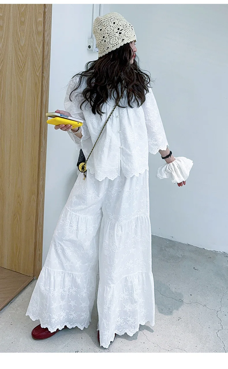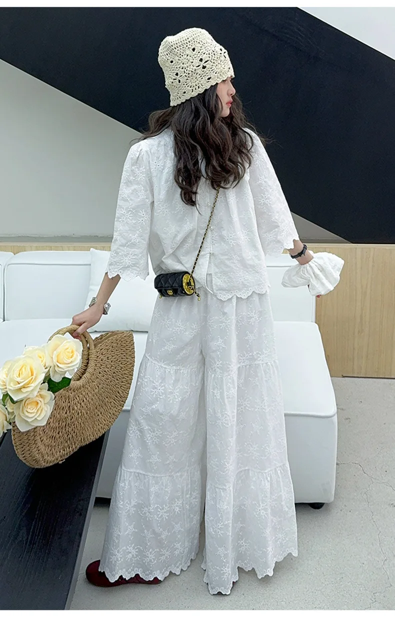 white teen girls clothes set Embroidered shirt+lace wide leg pants 2pcs chic junior kid suit child outfits vetement enfant fille
